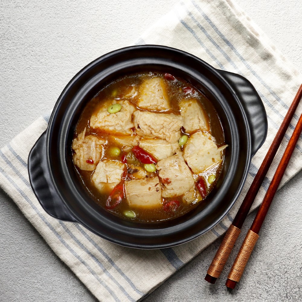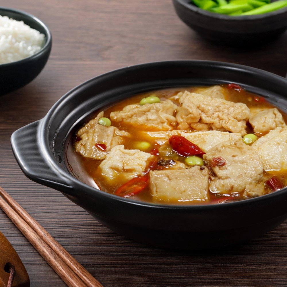 成份:水、芥花油、複方非基因改造大豆蛋白(分離大豆蛋白、馬鈴薯澱粉、麥芽糊精、植物酵素)、毛豆、藤椒油(菜籽油、藤椒)、豆鼓【黑豆、鹽、特砂、 (甜味劑)醋磺內酯鉀】、烏醋、豆瓣醬(辣椒、蠶豆、鹽、小麥粉、水)、糖、醬油、糯米粉、辣椒、鹽、素蠔油(水、蔗糖、非基因改造黃豆、小麥、鹽、乙醯化己二酸二澱粉、玉米糖膠、酵母抽出粉、香菇粉)、香料、複方調味料(大豆水解蛋白、L-麩酸鈉、酵母抽出物、麥芽糊精、鹽、糖、胺基乙酸、5'-次黃嘌呤核苷磷酸二鈉、5'-鳥嘌呤核苷磷酸二鈉、葵花籽油、琥珀酸)、花椒粒、木糖